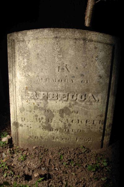 - Gravestone, "In/ memory of/ Rebecca/ wife of/ Dr W H Sackett/ who died/ Nov 18th 1852."