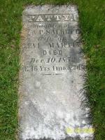 Martha A "Patty" Sackett, daughter of Isaac Sackett and Polly Hammond, was born in Colchester, Chittenden County, VermontG, on 7 November 1806.1,2 She died aged 46 in Plattsburgh, Clinton County, New York StateG, on 10 December 18521 and was buried at South Plattsburgh CemeteryG.4 She married in Burlington, Chittenden CountyG, on 14 February 1822, Levi Martin, son of Isaac Martin and Sabra Harrington.1,3 Levi was born in South Hero, Grand Isle County, VermontG, on 26 March 1800.4 He died aged 91 in PlattsburghG on 4 July 1891 and was buried at South Plattsburgh CemeteryG.4