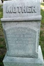 Mary Allen Sackett, daughter of Noadiah Sacket and Sophia Allen, was born in OhioG on 20 March 1817.1,2 She died on 8 February 18911 and was buried at Greenwood Cemetery, Grand Rapids, Kent County, MichiganG.5 She married in Sheffield, Lorain County, OhioG, on 18 August 1835, Frederick Day, son of John Day.1,3,4 Frederick was born in 18151 and died aged 25 on 11 August 1840.1,3