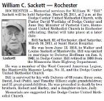 William Walter Sackett, son of Walter Orland Sackett and Louise Marie Burzlaff, was born in Mantorville, Dodge County, MinnesotaG, on 13 June 1918.1 He died aged 92 in Saint Mary's Hospital, Rochester, Olmsted County, MinnesotaG, on 19 March 2011.1 He married at Dodge Center, Dodge County, MinnesotaG, on 9 January 1943, Delores LaJune Hoffman.1