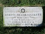 - "US Headstone Applications for Military Veterans, 1861–1985" (Ancestry image), "Sackett, Mervin Frank, ["enlisted 5 Aug 1917 discharged 11 Jan 1918" crossed through] enlisted 11 Aug 1942, discharged 6 Mar 1945, service no 37 257 524, pension claim 17 782 276, Nebraska, Cpl, medals none, ["US Army" crossed through] Detachment #2 904 Quartermaster Company, Quartermasters Corps, b. 3 Aug 1900, d. 16 Oct 1954, emblem: Christian (Latin Cross), flat marble marker, ship to Veterans Administration Cemetery, Los Angeles, Calif., applicant FK Breazeale, Chief, Mortuary Section, Los Angeles."