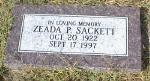 - US Social Security Administration, "Social Security Death Index" (American Ancestors transcript), "Zeada P Sackett, b. Oct 20, 1922, d. Sep 17, 1997, SSN 507-30-4811 issued NE, residence Blair, Nebraska, 68008, county Washington."