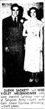 Glen Adrian Sackett, son of Jonathan Henry Sackett and Jane Bell Powers, was born in Dunlap, Peoria County, IllinoisG, on 8 February 1928.1,2 He died aged 83 in Alton, Madison County, IllinoisG, on 23 December 2011.1,2 He married in AltonG on 18 March 1950, Violet Meisenheimer, daughter of Harold J Meisenheimer and Louise B Bauer.3 Violet was born in Centralia, Marion County, IllinoisG, on 5 September 19303 and baptized at the College Avenue Presbyterian Church, AltonG, on 14 June 1936.4 She died aged 92 in AltonG on 21 February 2023.3