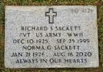 - "U.S. Veterans Gravesites" (Ancestry transcript), "Sackett, Richard S, Pvt, US Army, World War II, b. 10 Dec 1925, d. 25 Sep 1999, bur. Riverside National Cemetery, Van Buren Boulevard, Riverside, CA, 29 Sep 1999, service started 30 Oct 1943."