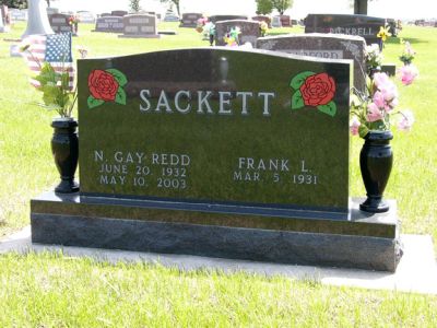 Frank Lewis Sackett, son of Arthur Emile "Art" Sackett and Edith Pearl Lewis, was born in Greenfield, Adair County, IowaG, on 5 March 1931.1,2 He died aged 94 in Stuart, Adair CountyG, on 23 May 2025 and was buried at Greenfield CemeteryG.1 He married at Columbus, Lowndes County, MississippiG, on 22 September 1951, Nellie Gay Redd, daughter of James Virgel Redd and Minna Massey.1 Nellie was born in Tuscaloosa, Tuscaloosa County, AlabamaG, on 20 June 1932.1 She died aged 70 in Des Moines, Polk County, IowaG, on 10 May 20031,3,4 and was buried at Greenfield CemeteryG.5
