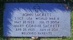 - "U.S. Veterans Gravesites" (Ancestry transcript), "Sackett, John, b. 28 May 1922, d. 15 Jul 2004, aged 82, bur. Santa Fe National Cemetery, 501 North Guadalupe Street P. O. Box 88 Santa Fe, NM 87501, plot Section 13 Site 980, 20 Jul 2004, service start 10 Nov 1942, service end 1 Jan 1946, notes: S Sgt US Army World War II."