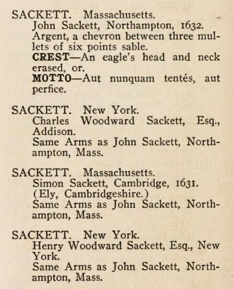 An entry for Colonel Henry Woodward Sackett, presumably submitted by him, and repeating the claim to a right to the arms, appeared in Matthews' American Armoury and Blue Book4, published in 1907: