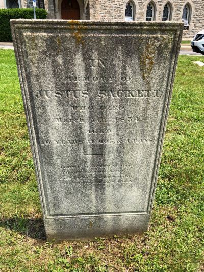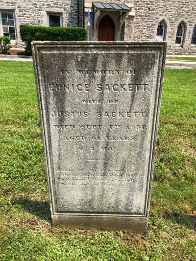 - Gravestone, "In/ memory of/ Rebecca/ wife of/ Dr W H Sackett/ who died/ Nov 18th 1852."