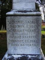 - Find a Grave, Woodbridge Cemetery, Catatonk, Tioga County, NY, "Nathaniel Sackett / Died Nov 5, 1817 / Aged 47 years." "Sarah Sackett / Died Oct 23, 1862 / Aged 84 years." On left side of monument: "US veteran."
