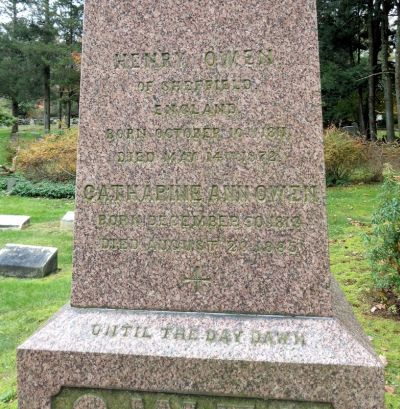 - Gravestone, "Henry Owen/ of Sheffield/ England/ born October 10, 1811/ died May 14, 1872./ Catharine Ann Owen/ born December 30, 1813/ died August 23, 1885."