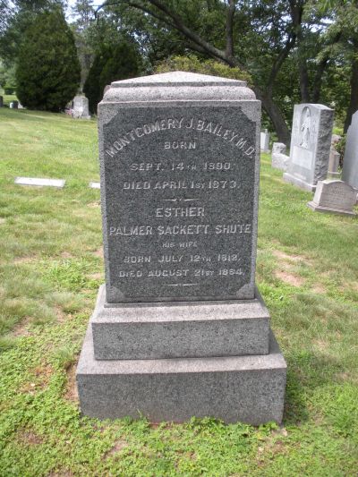 Esther Palmer Sackett Shute, daughter of ___ Shute and Hannah Alsop Sackett, was born in Manhattan, New York CityG, on 12 July 1812.1,2,3 She died aged 82 in Saugatuck, Fairfield County, ConnecticutG, on 21 August 18944 and was buried at Mount Olivet Cemetery, Maspeth, Queens County, New York StateG.2 She married Montgomery Bailey MD.
