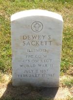 Sackett, Dewey S, son, 22, single, b. IL, father b. IL, mother b. IL, section hand, railroad, worker. - "US World War II Army Enlistment Records, 1938–1946" (Ancestry transcript), "Dewey S Sackett, b. 1897, b. Illinois, res. Pike, IL, enlisted 5 Nov 1942, at Peoria, IL, Private, educ 2 yrs high school, civil occ farm hand, single without dependents, ht 65, wt 129."