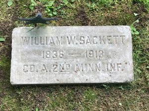 - "1890 Veterans Schedules" (Ancestry image), "Wm W Sackett, Private, A Company, 2 Minn Infty, enlisted 26 June 1861, discharged 6 June 1862, service 11m 10d, PO address Lanesboro, Minn."