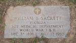 - "US Headstone Applications for Military Veterans, 1861–1985" (Ancestry image), "Sackett, William B, b. 27 Dec 1901 ["1901" deleted and "1898" written] d. 12 Jul 1950, bur Brackettville Catholic Cemetery, enlisted 20 Sep 1920, serial 6324006, discharged 13 Dec 1944, rank Sgt (Ret), Medical Department. Applicant: Marie M Sackett, 20 Jul 1950, of Box 152, Spring St, Brackettville, Texas."