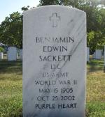 - "U.S. Veterans Gravesites" (Ancestry transcript), "Benjamin Edwin Sackett, LTC US Army, World War II, b. 15 May 1905, d. 25 Oct 2002, bur. Arlington National Cemetery, 9 May 2003, section 67, site 4058, service start date 29 Jun 1943."