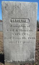 Caroline Sackett, daughter of Gad Sackett and Hannah Cadwell, was born about 1822. She died aged 17 in Russell, Hampden County, MassachusettsG, on 16 June 1839 and was buried at Russell CemeteryG.1