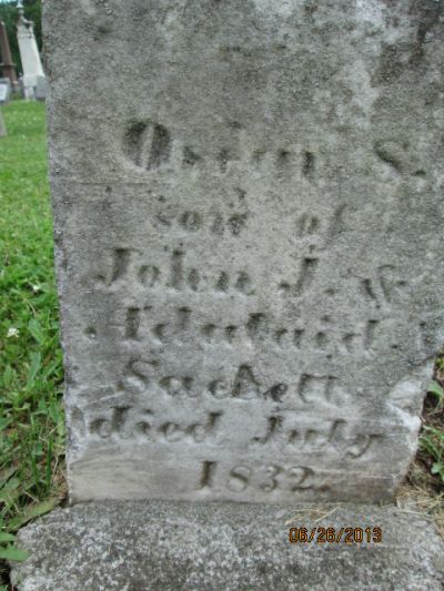 - Gravestone, "Oscar S./ son of/ John J &/ Adalaid/ Sackett/ died July/ 1832."